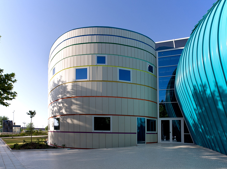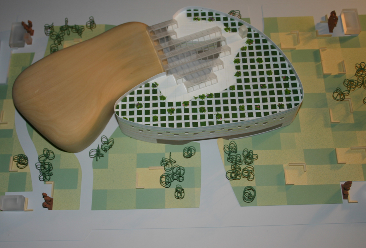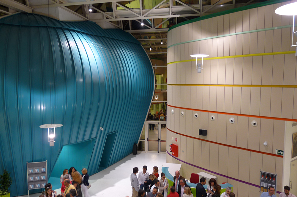 El salón de actos con una forma sensual, volumétricamente rotundo y único penetra dentro del atrio para ser acogido por el Centro Cultural que también sinusoidal lo abraza.